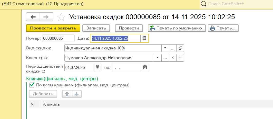 В конфигурации "1С-бит стоматология" скидка автоматически не подставляется в документ. Нужно всегда нажимать кнопку "Пересчитать скидки".