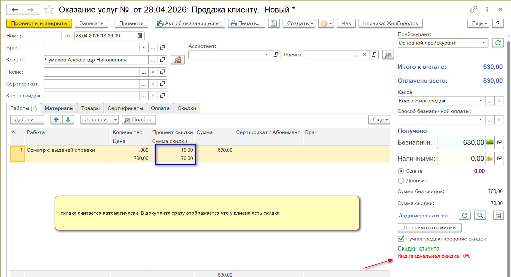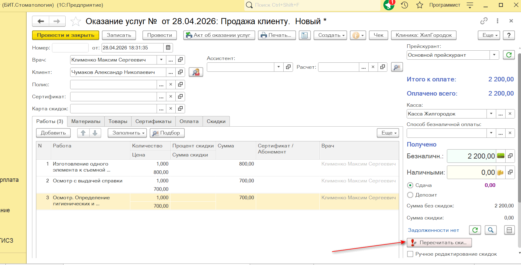Нужно каждый раз нажимать кнопку "пересчитать скидки" чтобы программа проверила есть ли у клиента скидки и подставила скидки в документ.