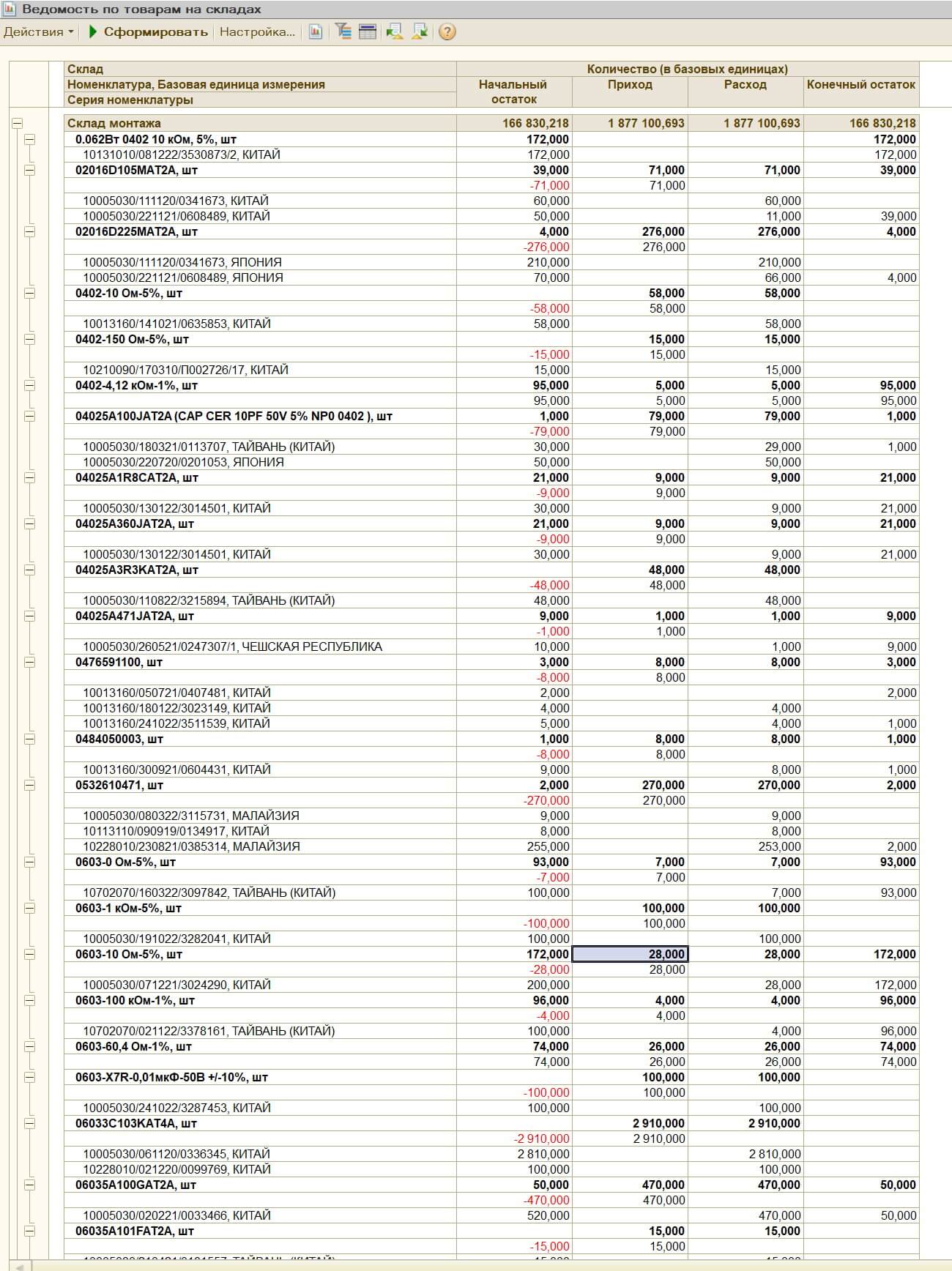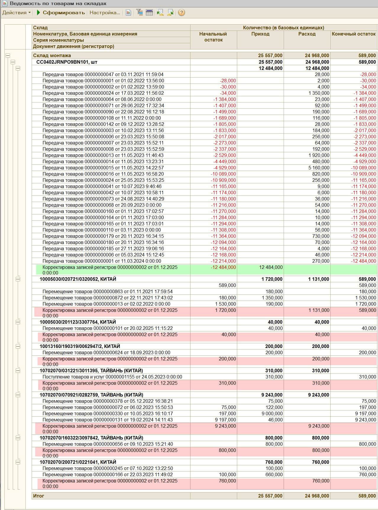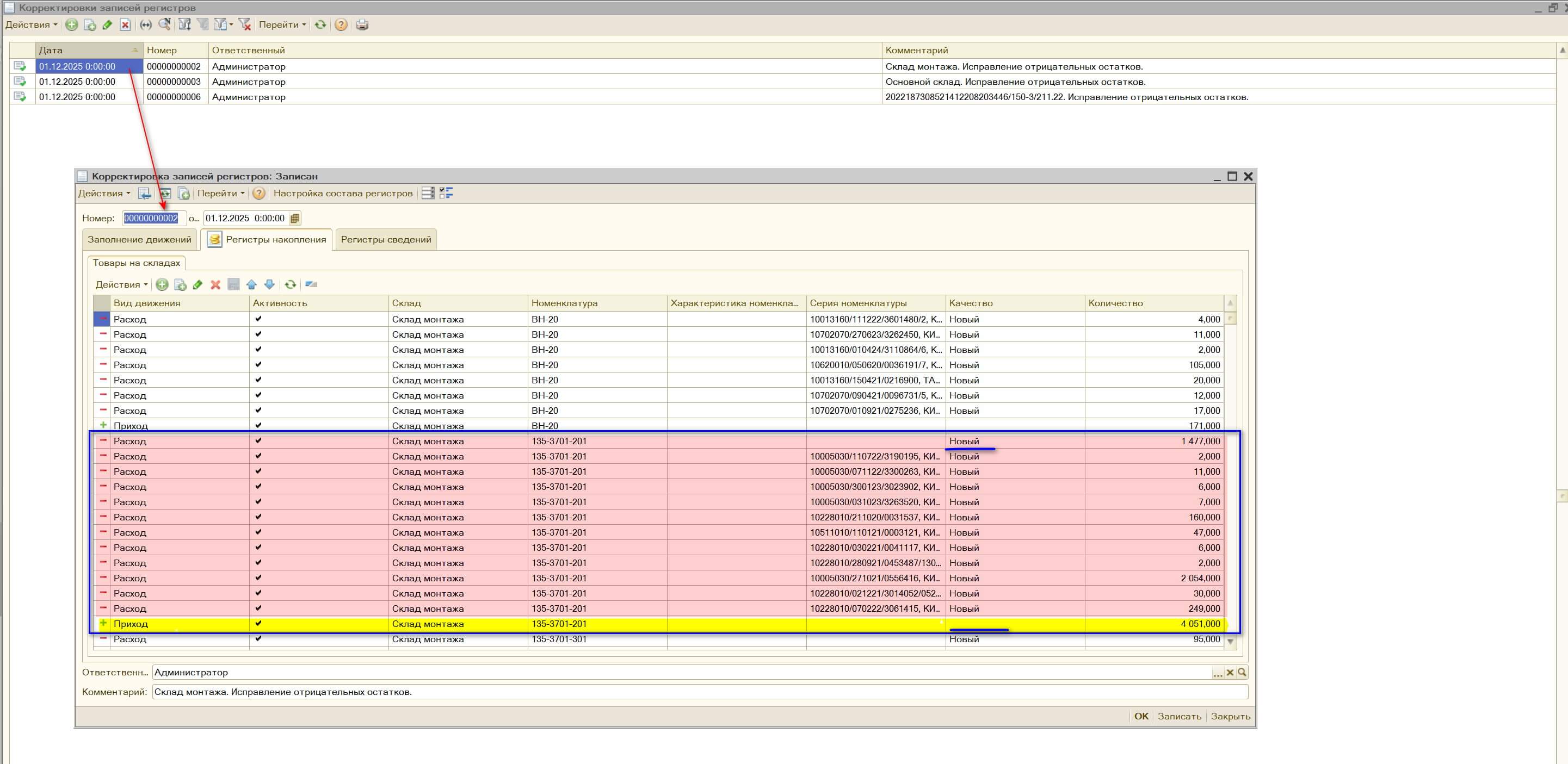 красным это расход остатков с сериями (это документы должны были делать, если бы правильные были). Желтым это мы оприходуем остаток чтобы убрать минус. Само собой в сумме расход и приход у нас равны.