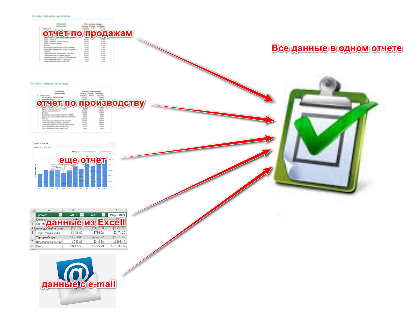 Информацию можно брать только из отчетов? А то у нас часть данных делаются через обработку, еще данные в Эксель и на e-mail.