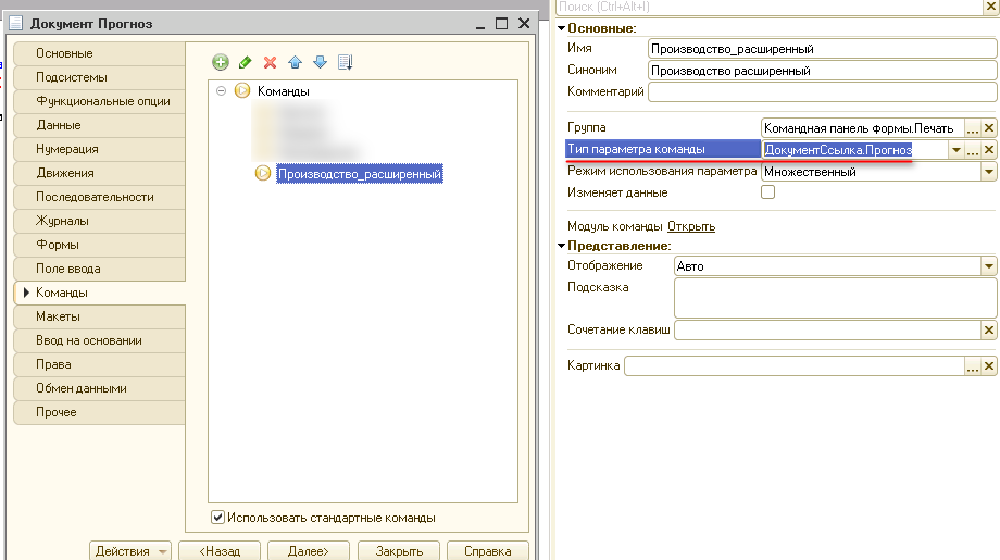 В тип парамера команды указываем документы откуда будет вызываться эта команда. Макет тоже называется "Производство_расширенный".