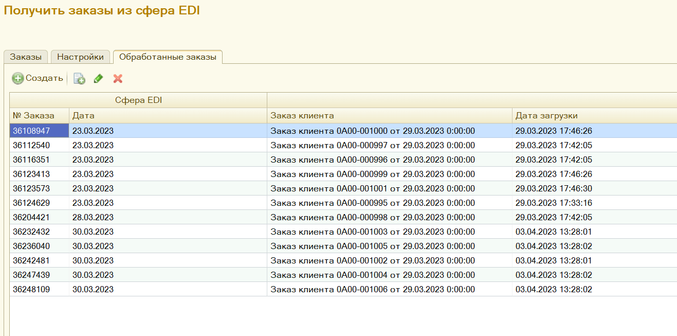 В результате была сделана нужная обработка интеграция 1С с сервисом Сфера EDI