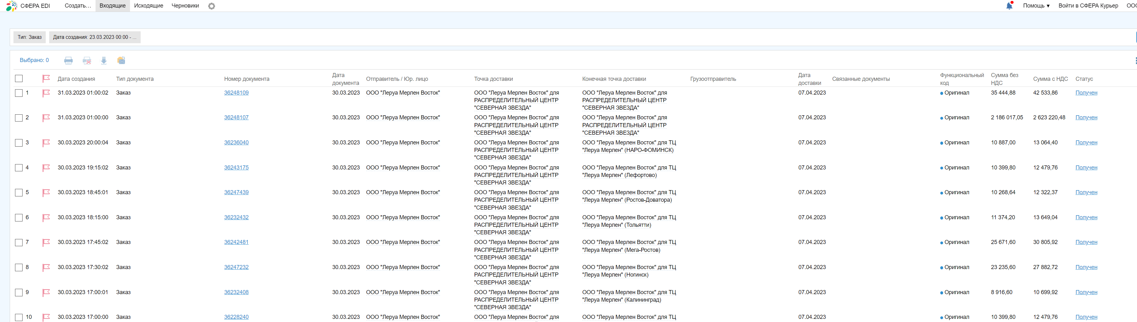 Покупатель "Леруа Мерлен" скидывает заказы в портал Сфера EDI.