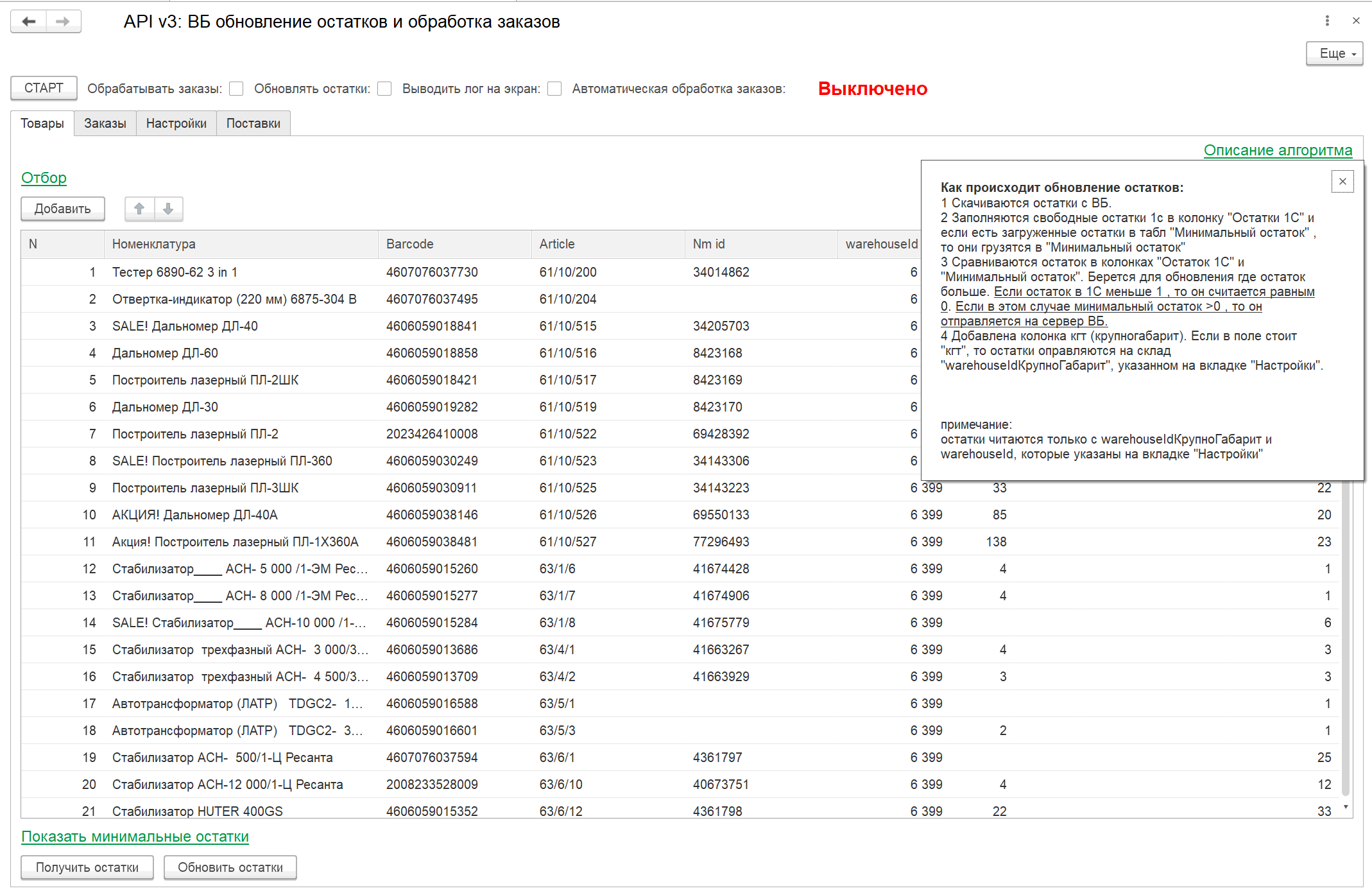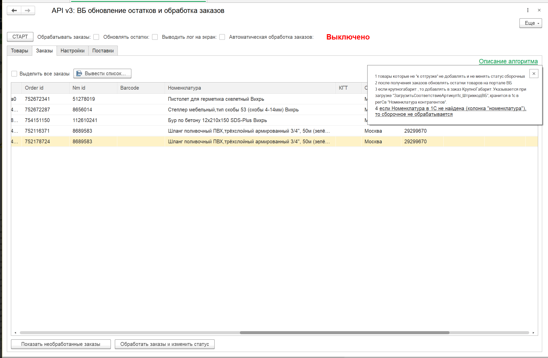 - Получить заказы в 1с в автоматическом и ручном режиме, писать полученные заказы в заказ клиента, запоминать номер поставки. После добавления заказов в 1с добавлять эти заказы в сборочное на портале ВБ.