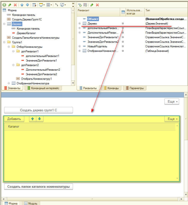 2 создадим на форме реквизит "дерево" с типом "деревоЗначений".