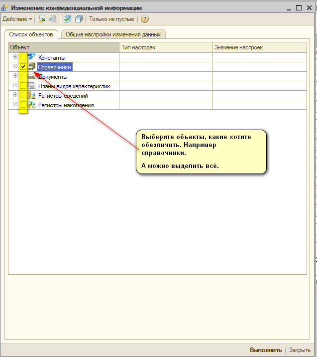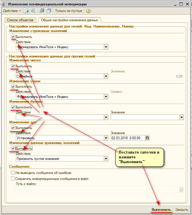Общие настройки изменения данных - тут выбираете алгоритм обезличивания. Достаточно просто проставить галочки.