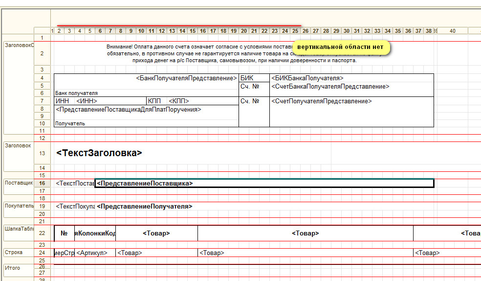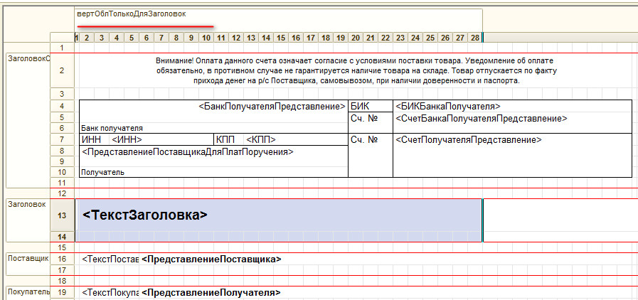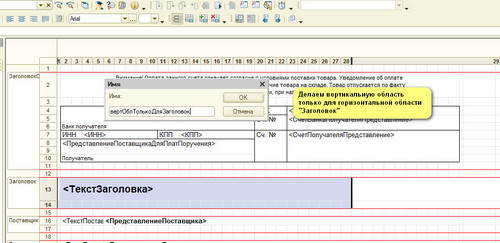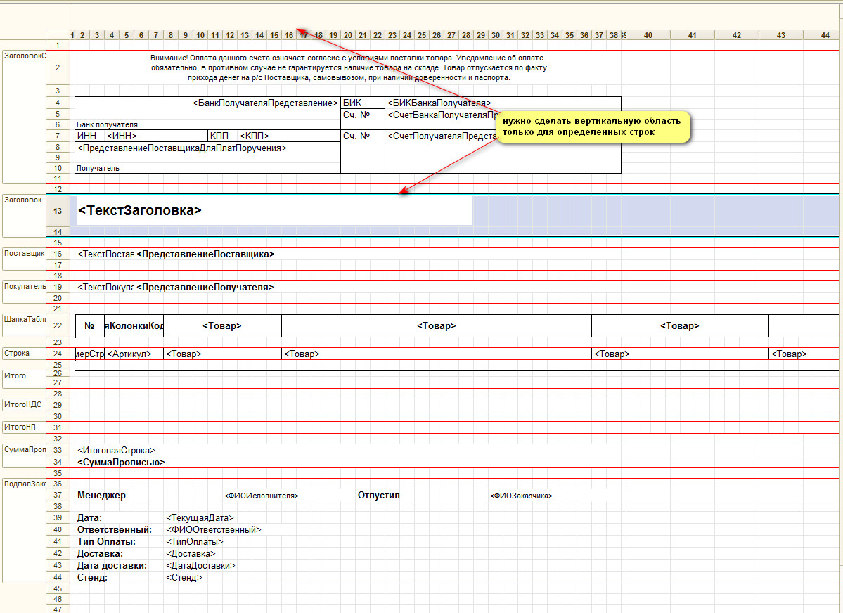 В данном примере буду делать вертикальную область только для строк №13,14. Они уже включены в горизонтальную область "Заголовок".