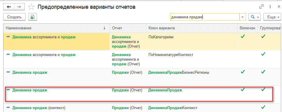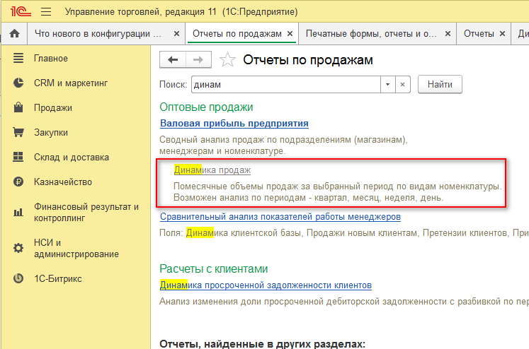 Вот нужный справочник, найдем в нем отчет(вариант отчета) "Динамика продаж":