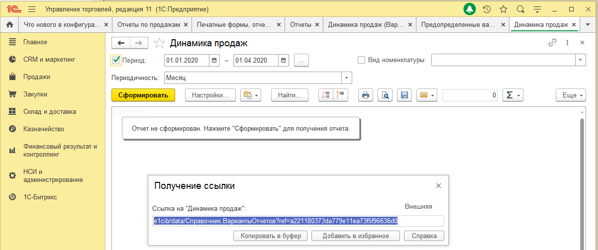 Запустим отчет "динамика продаж" и кликнем на "получить ссылку":