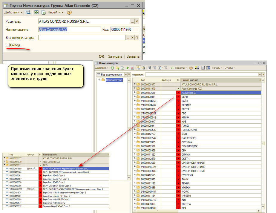 Процедура ВыводПриИзменении(Элемент) // событие при изменении реквизита "Вывод" ИзменитьВыводАссортиментаУподчиненныхЭлементов(); КонецПроцедуры Процедура ИзменитьВыводАссортиментаУподчиненныхЭлементов(родитель=неопределено) Если родитель=неопределено тогда родитель=ЭтотОбъект.Ссылка; конецЕсли; выборка=ВыборкаПодчиненныхЭлементов(Родитель); Пока выборка.Следующий() цикл Если выборка.ссылка.этоГруппа тогда ИзменитьВыводАссортиментаУподчиненныхЭлементов(выборка.ссылка);//Вызываем рекурсивно КонецЕсли; элНом=выборка.ссылка.получитьОбъект(); //+ указываем какие реквизиты нужно поменять элНом.Вывод=Вывод; //- указываем какие реквизиты нужно поменять элНом.записать(); конецЦикла; конецПроцедуры Функция ВыборкаПодчиненныхЭлементов(родитель) запрос=новый запрос; запрос.Текст= "ВЫБРАТЬ | Номенклатура.Ссылка |ИЗ | Справочник.Номенклатура КАК Номенклатура |ГДЕ | Номенклатура.Родитель = &Родитель"; запрос.УстановитьПараметр("родитель",Родитель); выборка=запрос.Выполнить().Выбрать(); возврат выборка; конецФункции